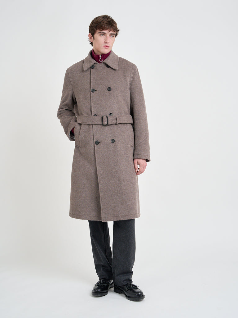 A robust double-breasted winter trench coat cut from recycled wool, featuring a turn-down collar and horn buttons, the Big Coat is your ultimate winter layer to protect you from the elements. Inspired by the military originals, this taupe version offers a modern take on the classic. and comes belted so you can create a flattering waisted silhouette. This version features mohair in the wool blend, which provides a slightly raised nap not dissimilar to flannel, giving it a soft tactile finish.